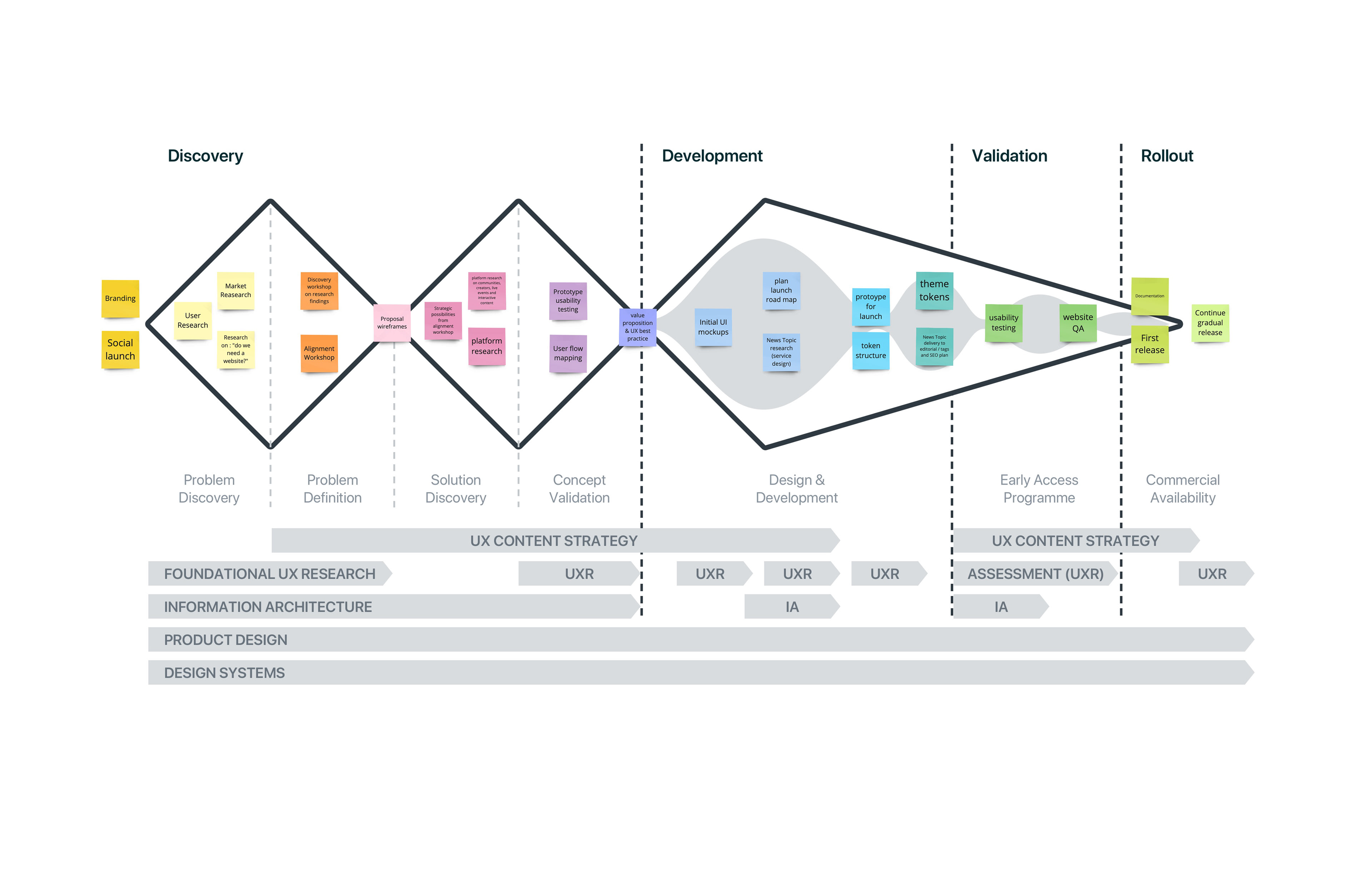 As the product designer I made sure we followed the appropriate processes as it was our first chance to create a product from 0 making sure Research and UX lead the way in the creation of this. The product being a social first news outlet for young people, and our audiences all being almost over 35 years old, there was a lot of worries from stakeholders on how we might make the right decisions for our target audience. This is why we mapped out a plan that obviously could be iterated catering to our findings, but set the ground on how we were going to make sure as a design team that the right product was going to be developed.